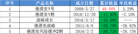 据私募排排网相关数据显示,公司目前公布净值的5个基金产品,仅2009年成立的明星产品德源安1号取得49.08%的累计收益,而年化收益仅为5.29%,和国债收益率相差无几。其余4个产品净值表现跌去10%以上,成立于2016年2月的德源安风险缓冲2期,在没有遇上市场大幅下跌的情况下,竟然跌去30.71%,首尾产品相差近80%。