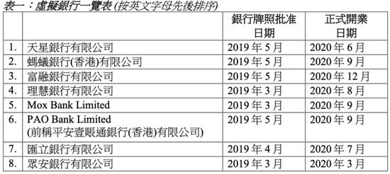 2019年,香港金管局陆续发出3批共8张虚拟银行牌照。今年8月初,香港金融管理局发表对虚拟银行的检讨报告,以审视虚拟银行的营运情况及其对香港银行体系的影响。