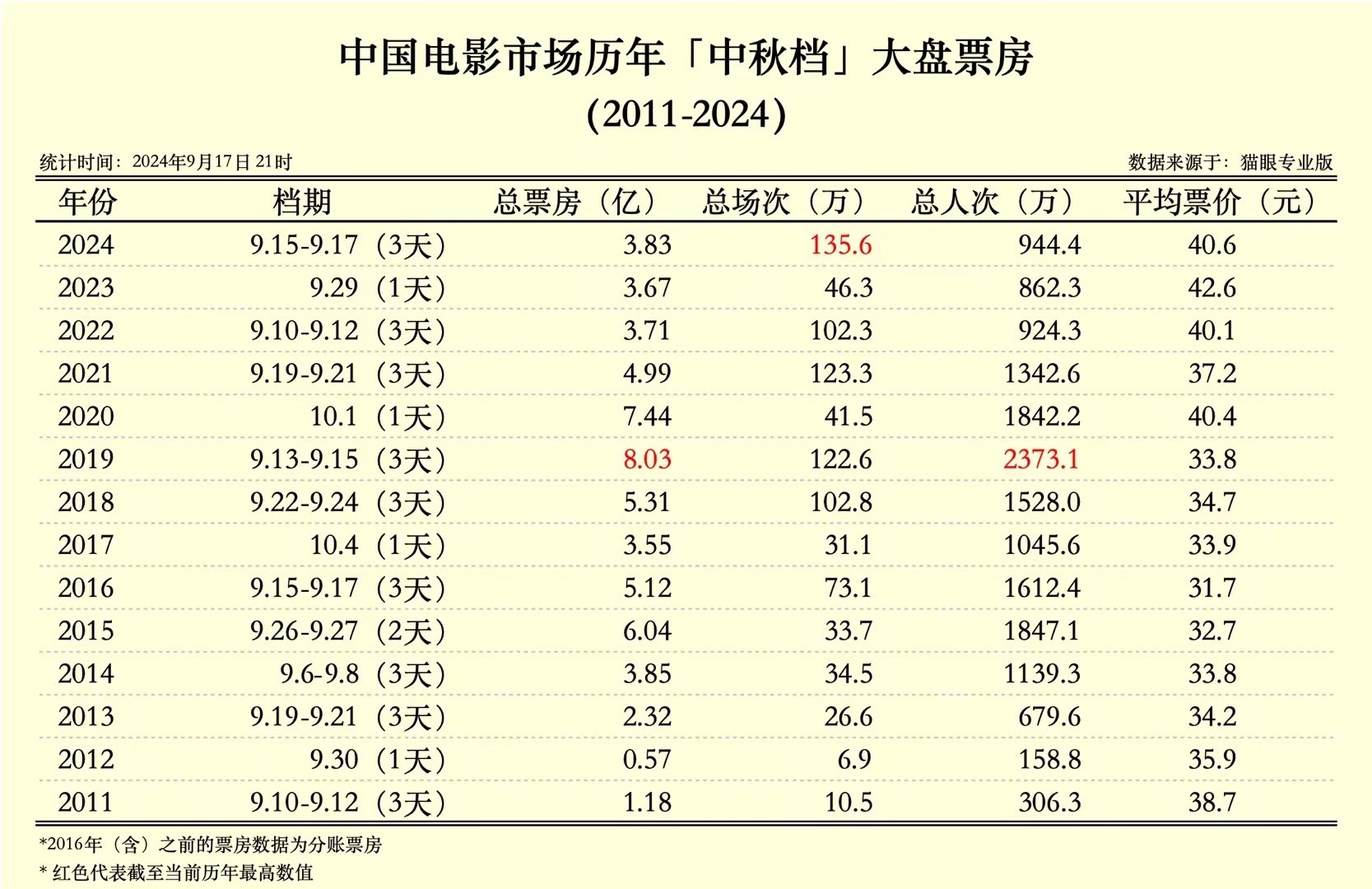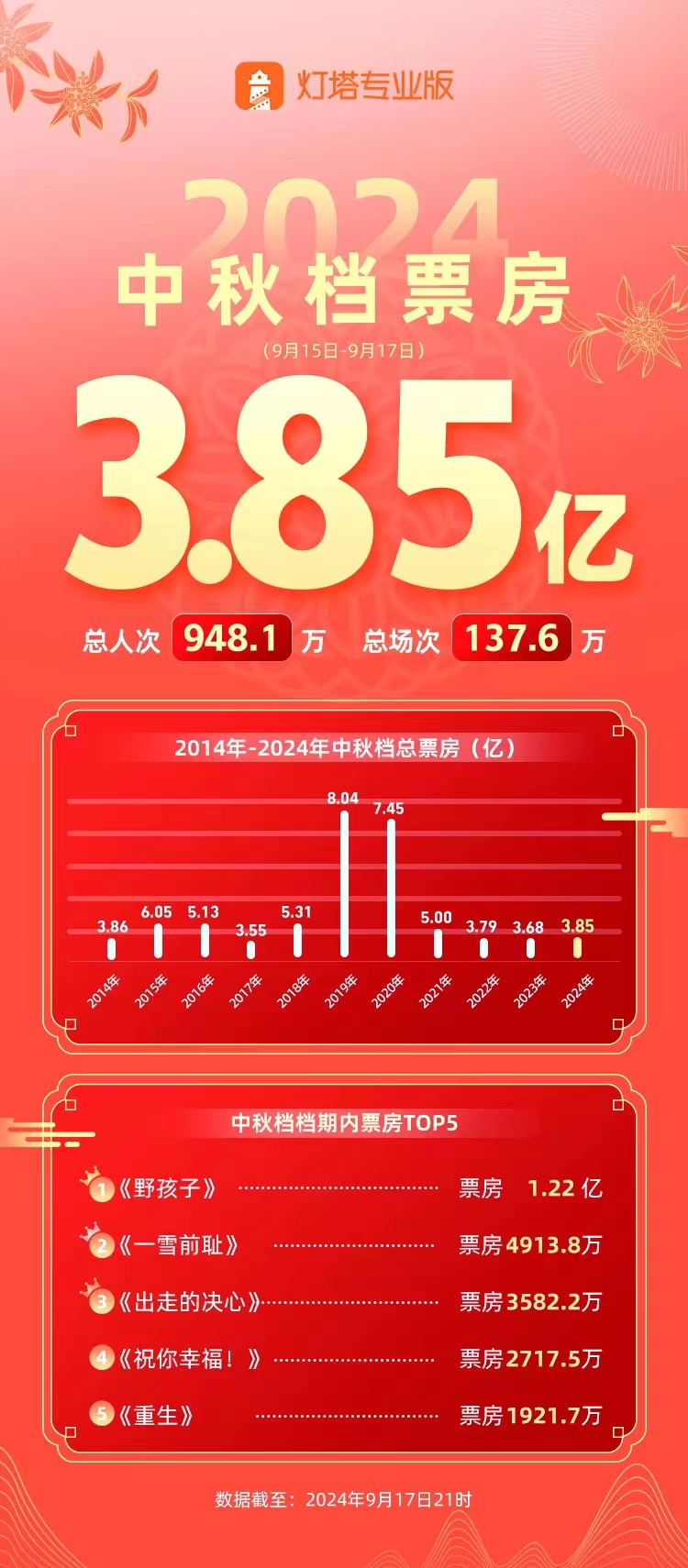 据灯塔专业版,2024中秋档(9月15日-17日)票房3.85亿,略高于2022年和2023年。电影《野孩子》以1.22亿成为2024中秋档票房冠军,《一雪前耻》《出走的决心》《祝你幸福!》《重生》分列档期票房二至五位。
