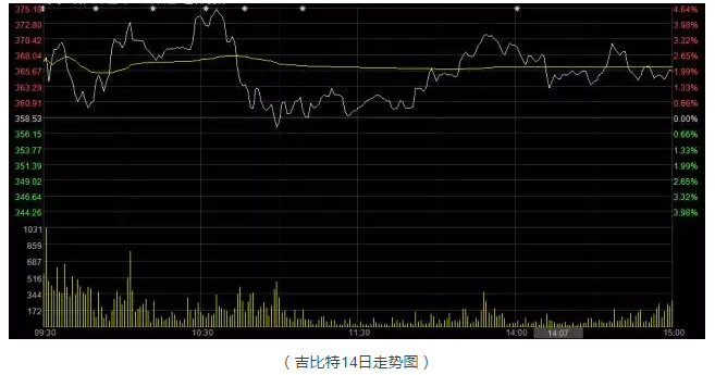 时钟回拨至14日盘中。前一日涨停的吉比特延续涨势,以整数价每股367元开盘,较早盘平开的贵州茅台股价371.55元差距已不足5元。随后在买单涌入下,吉比特股价在开盘后5分钟内一度突破370元。此后,经过小幅调整,公司股价重拾升势,于10时左右一举上探至最高373.88元,盘中股价超越茅台,成为两市第一高价股。
