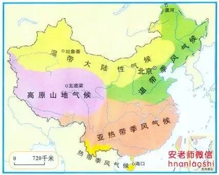四大块相对应的气候:温带季风气候、亚热带季风气候、高原高寒气候、温带大陆性气候、热带季风气候