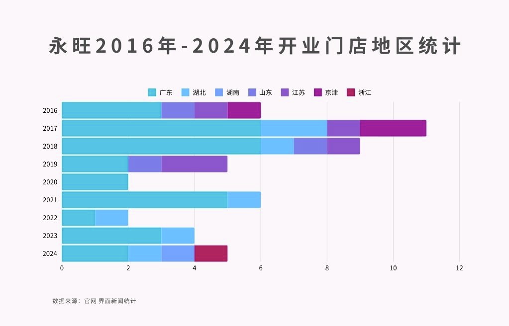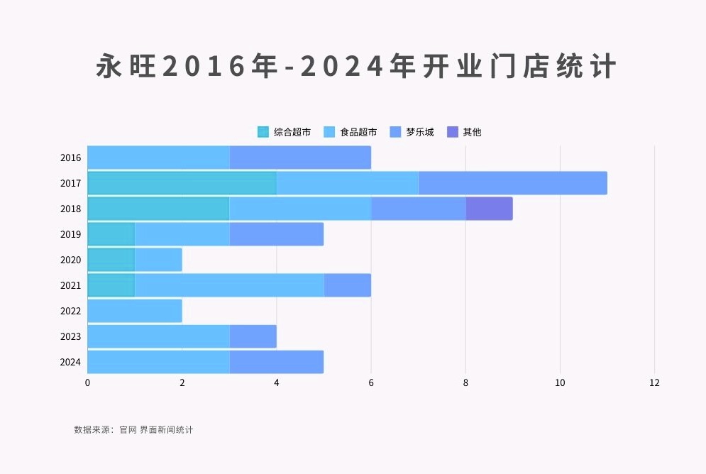 2016-2024年,永旺新开的食品超市有超7成都在广东。截至目前,永旺梦乐城在中国内地总门店数达24家,其中湖南湖北有5家。