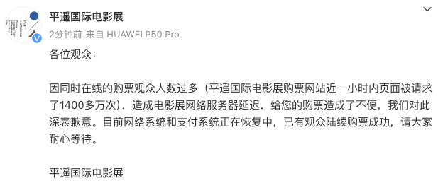 9月19日下午,平遥国际电影展官方微博发布公告称,“因同时在线的购票观众人数过多(平遥国际电影展购票网站近一小时内页面被请求了1400多万次),造成电影展网络服务器延迟,给您的购票造成了不便,我们对此深表歉意。目前网络系统和支付系统正在恢复中,已有观众陆续购票成功,请大家耐心等待。”