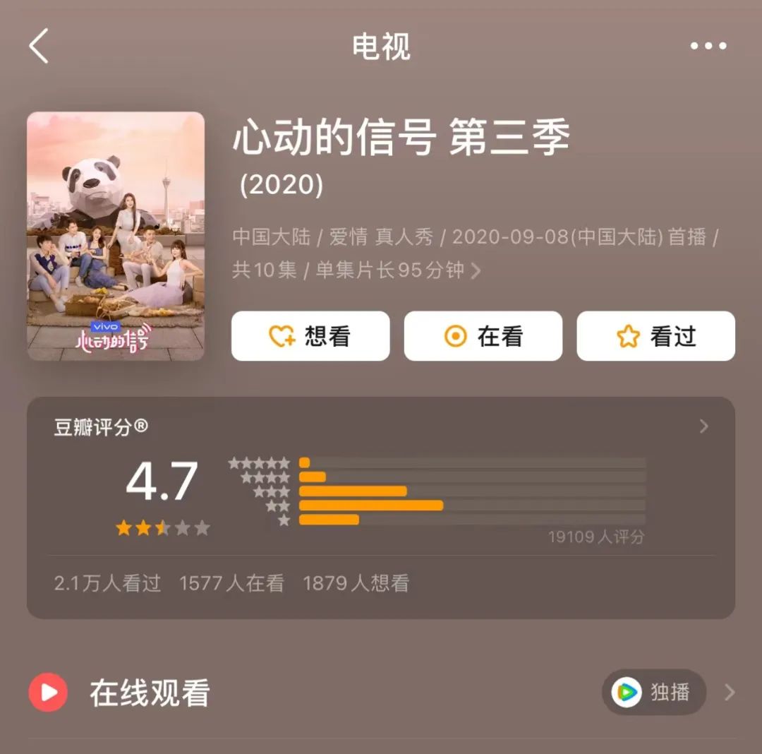 最终,《心动的信号3》口碑两极分化,豆瓣评分仅有4.7分,是史上最低的一季,网友犀利吐槽:“作为×漂观众,除了感受到人与人之间的阶级鸿沟,要如何投射和代入恋情养成的节目之中?”不过,云合数据显示,《心动的信号3》收视率在当年网综里排名Top1。