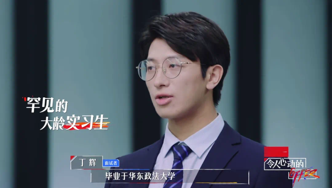 《令人心动的offer 2》里,30岁的丁辉本科是二本非法学专业,后跨考华东政法大学硕士,在律所工作一年后裸辞,并以倒数第一名的成绩入选君合律师事务所实习生。
