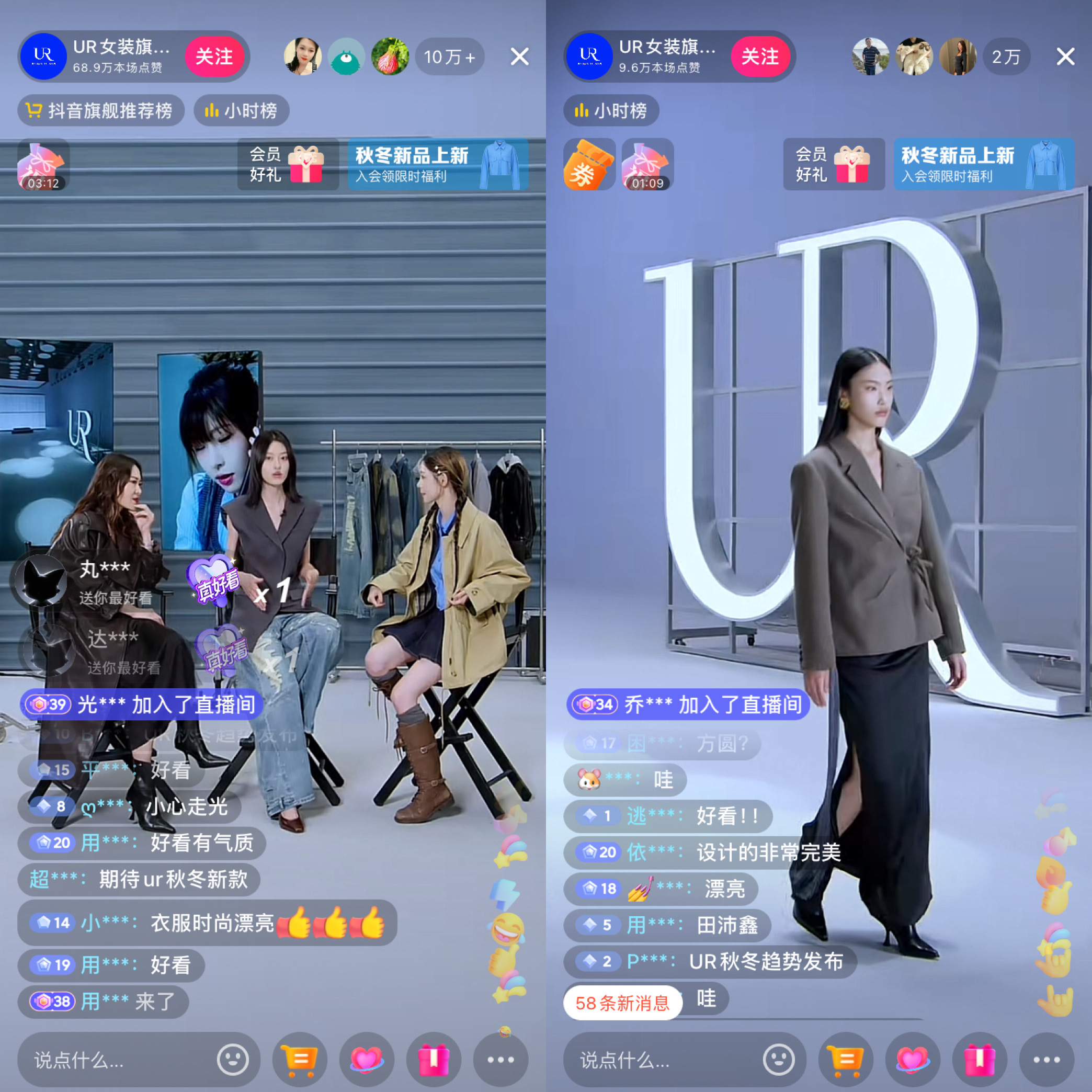 值得提到的是,就在Zara与Harry Lambert联名场直播的当晚,中国快时尚品牌URBAN REVIVO也在抖音首次尝试“秀场式”直播,请来模特田沛鑫和《时尚芭莎》时装主编卫甜担任主持人,以及抖音头部博主痞幼、方圆和演员赵奕欢到场。与Zara类似,这场主题为“秋冬趋势发布秀”的直播并未上架商品,而是以新品介绍和展示品牌形象为主。