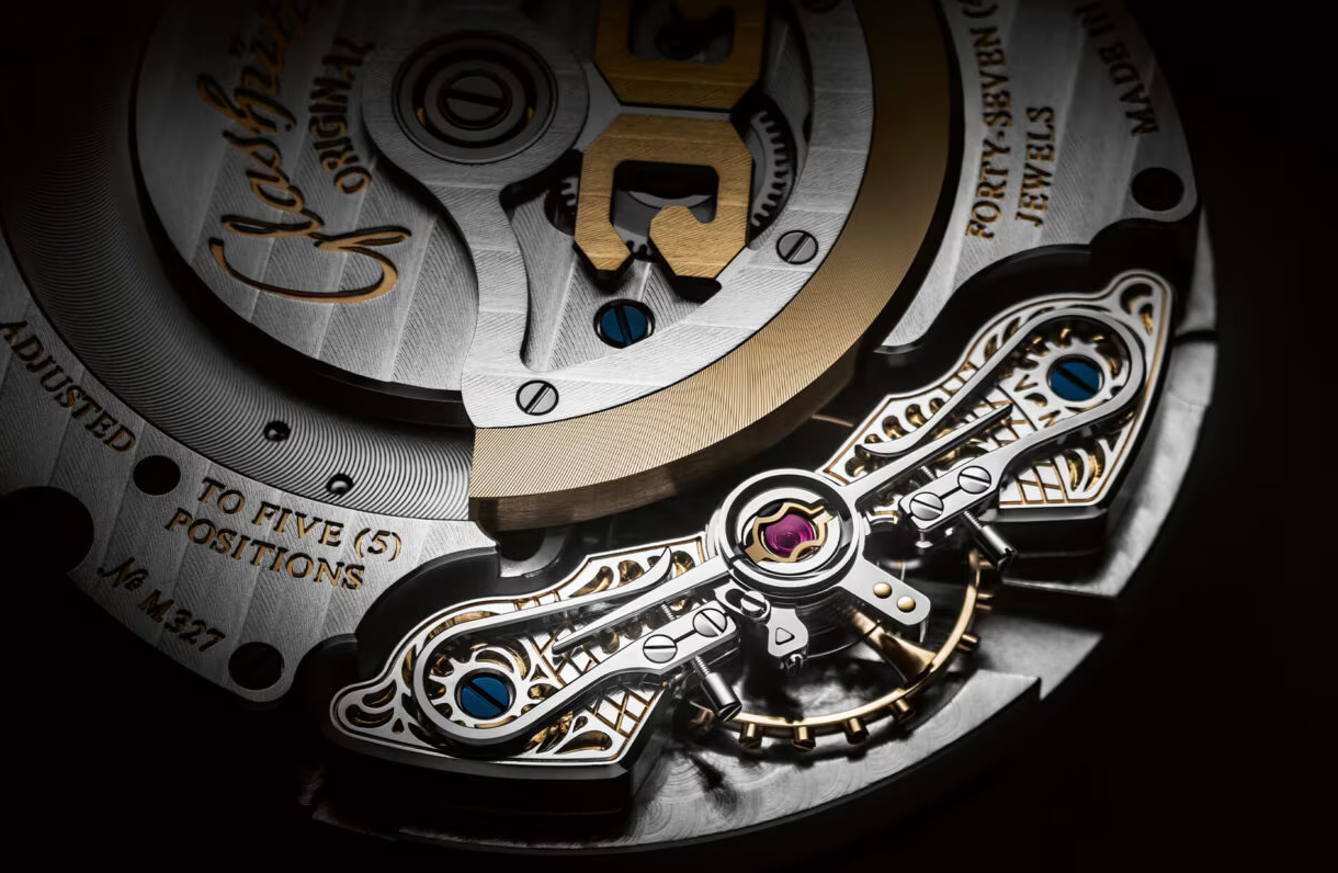 本款时计的表底同样精湛卓绝,自制机芯Calibre 90-02的精美装饰与迷人魅力印入眼帘,风光无限。透过蓝宝石水晶玻璃表底盖,格拉苏蒂制表传统特征一览无遗:传承悠久的四分之三夹板、带格拉苏蒂柱状纹的镂空自动陀、蓝钢螺丝、抛光钢质零件和双鹅颈微调,令观者心醉痴迷。