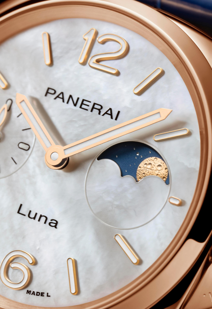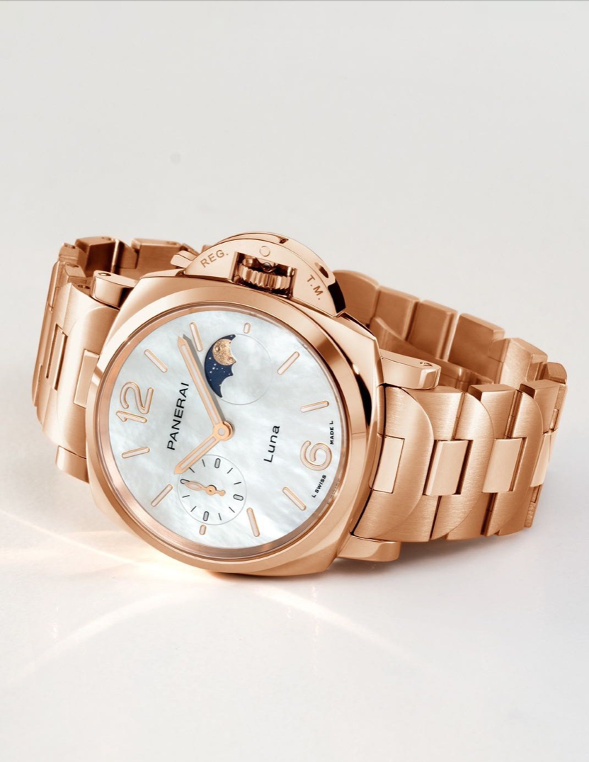 星月流光,红金溢彩。沛纳海Luminor Due庐米诺杜尔系列38毫米自动上链红金月相腕表,采用Goldtech™红金材质表带及表链,以浓郁色泽渲染月晕金辉。