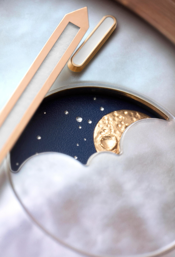 这款腕表的月相显示卓尔不群,品牌自制月亮盘闪耀迷人光晕。制表匠人先用小巧的铣刀巧妙地切削出两轮月亮,令其呈现优雅的弧形,然后再用钻石铣削工具对其表面进行抛光处理,使其在电镀深蓝色星空的映衬下熠熠生辉,魅力难挡。