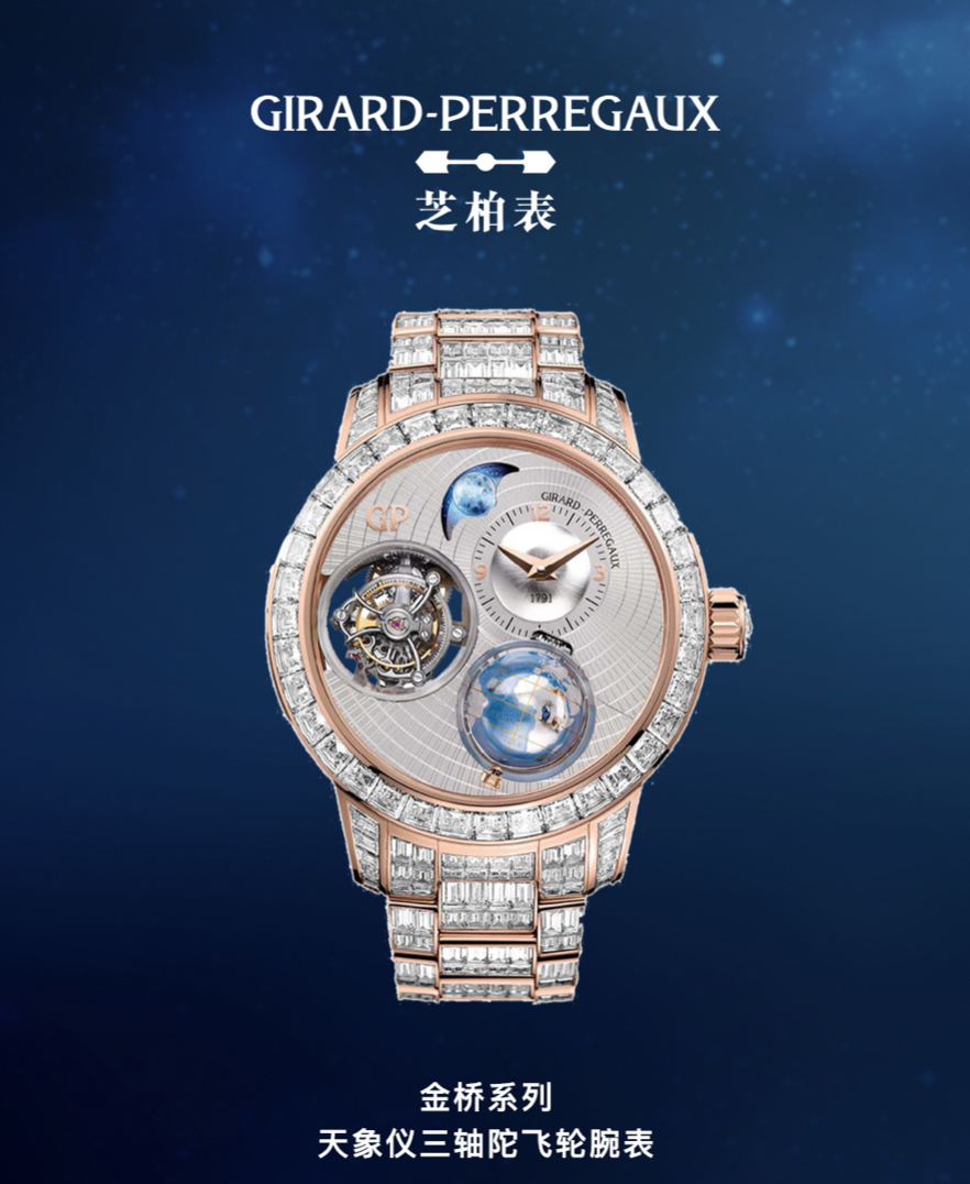 天地轮转,四序更迭,仰望苍穹,唯有一轮明月永恒。GP芝柏表以精湛的专业制表技艺,将跨越时空的浪漫天文美学定格于天象仪三轴陀飞轮腕表。