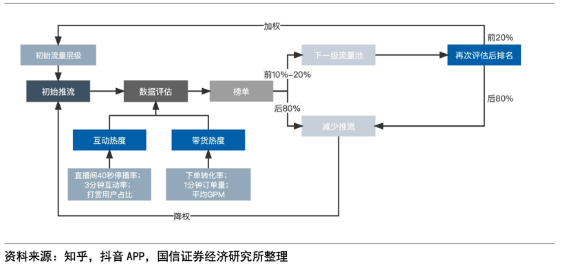 国信证券对此曾有如下概括:抖音针对每个直播间会给予一定基础流量,根据直播间短期表现调整排名,并提升排名前10-20%直播间的流量进入天花板更高的下一级流量池;短期表现的参考指标为互动热度及带货热度,其中互动热度指标参考直播间40秒停留率、3分钟互动率、打赏用户占比等,带货热度指标包括下单转化率、1分钟订单量、平均 GPM(即流量向销售额的平均转化率,GPM=流量数*点击率*转化率*客单价)等。