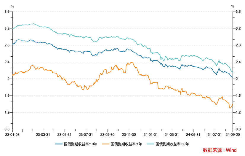 Wind数据显示,10年国债收益率由去年底的2.56%下行至9月20日的2.04%,下行了52BP。同期1年期国债收益率、30年期国债收益率分别下行了69BP、68BP。