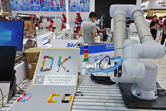 在中科新松的展台,该公司与达宽科技合作研发的一台积木拼搭机器人也是首次公开亮相。