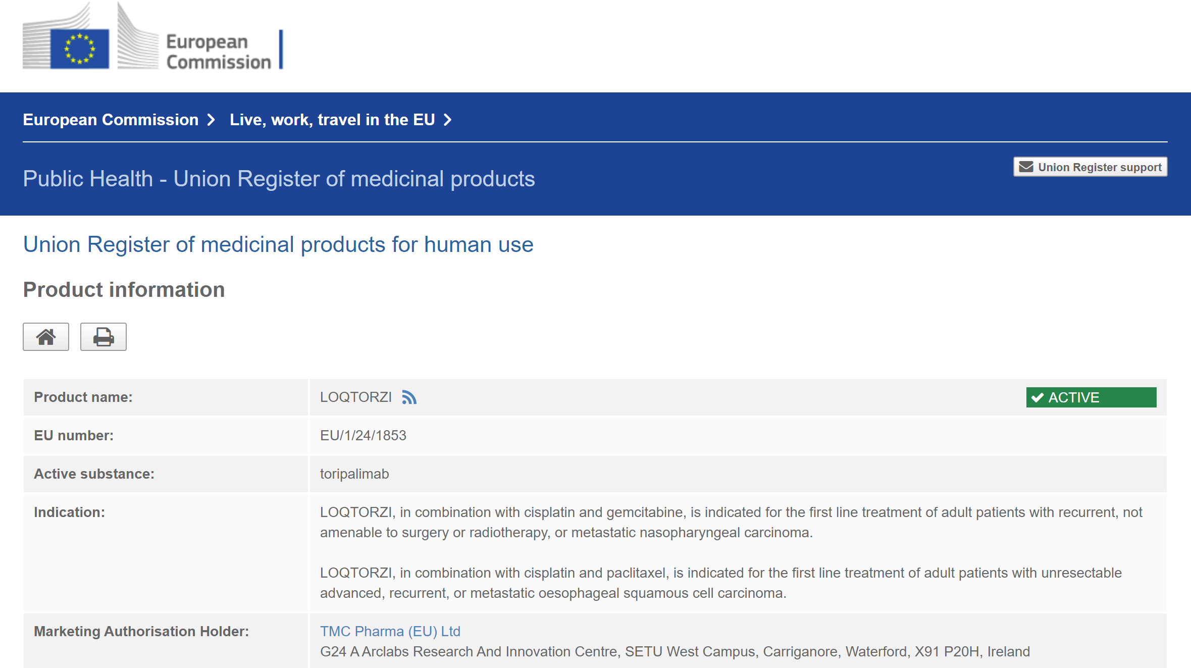当地时间9月23日,据欧盟官方网站,君实生物的特瑞普利单抗(欧洲商品名:LOQTORZI®)已获批。