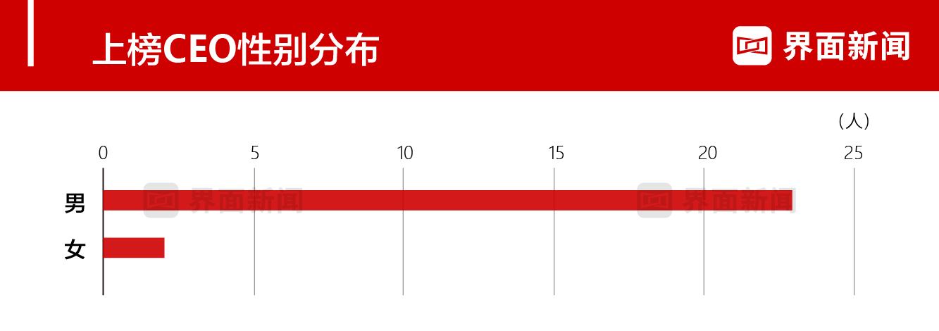 上榜的25位CEO平均年龄51岁,其中最年轻的当属通威股份的刘舒琪,今年35岁。刘舒琪还是本届榜单中唯二的女性CEO之一,另一位是福莱特的阮泽云。