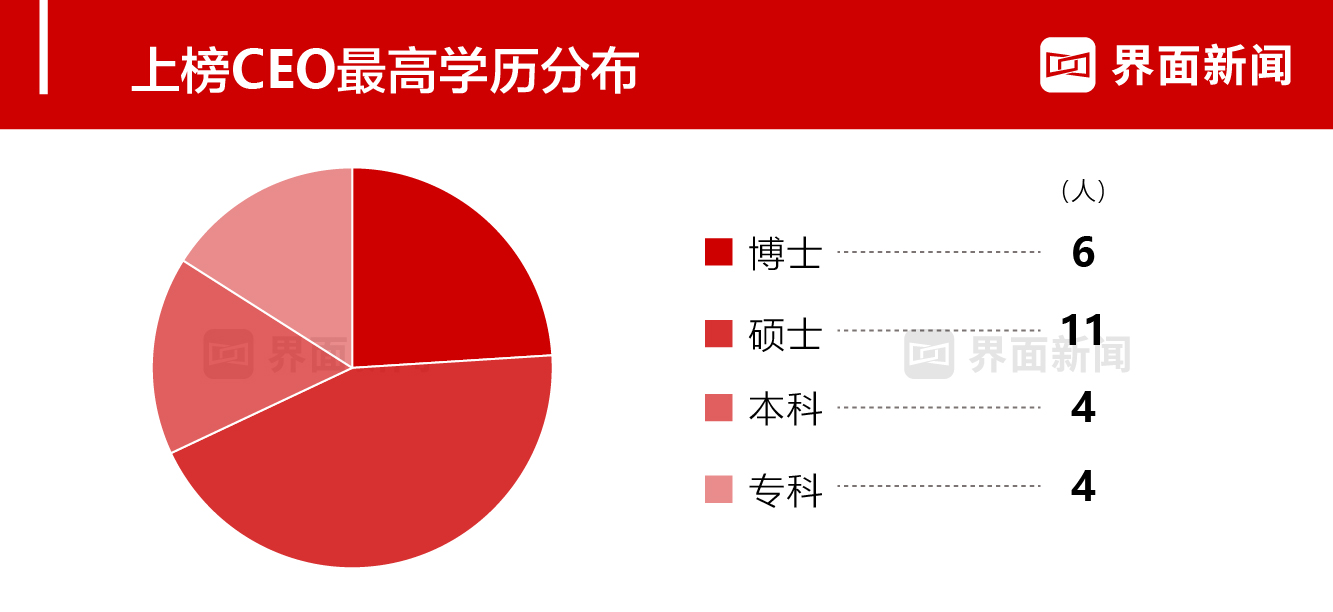 新能源领域作为知识密集型与技术密集型产业,高程度依赖科技创新水平与制造业发展水平。对企业而言,高管的学历背景也备受关注。25位上榜CEO中,最高学历为硕士的有11人,占比达到44%;博士6人,占比24%。