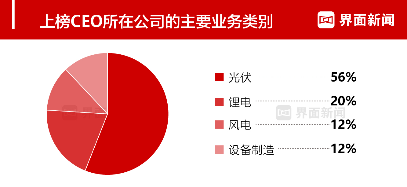 从上榜CEO所在公司的主营业务来看,以光伏相关业务为主的公司占比最多,共有14家;主营锂电相关的公司有5家;主营风电和设备制造的公司各有3家。