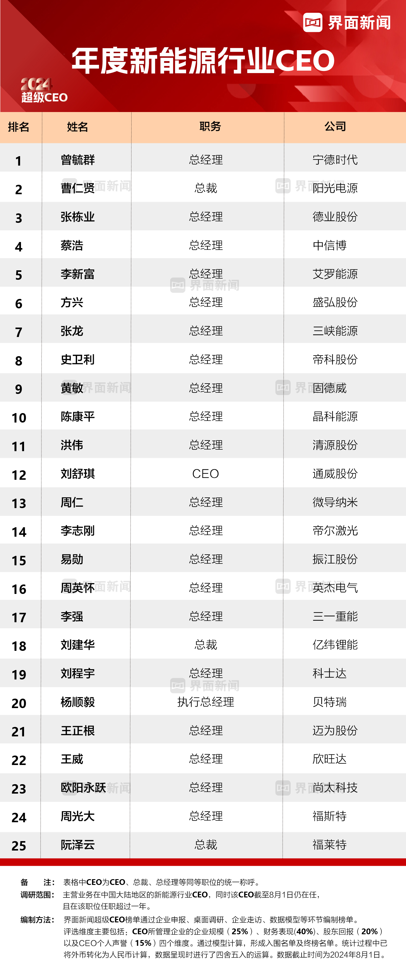 本篇中CEO为首席执行官、总裁、总经理等同等职位的统一称呼。我们的研究面向中国地区新能源企业CEO。界面新闻超级CEO榜单通过企业申报、桌面调研、企业走访、数据模型等环节编制榜单。评选维度主要包括:企业规模(25%)、财务表现(40%)、股东回报(20%)、个人声誉(15%)四个维度。通过模型估算,形成入围名单及终榜名单。统计过程中已将外币转化为人民币计算,数据呈现时进行了四舍五入的运算。