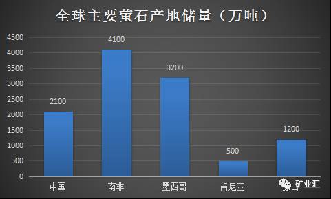 萤石资源在世界各地分布不均,据美国地质局测算,全球储量1.29亿吨。萤石资源主要分布在非洲的南非、肯尼亚,亚洲的中国、蒙古,北美洲的墨西哥等地;欧洲的西班牙、法国等地也有一定的储量。