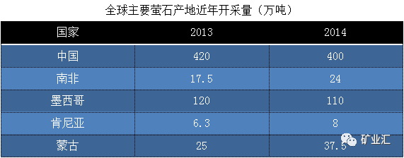 1984年中国超过墨西哥,成为世界最大的萤石生产国。中国目前开采量居全球第一,2011年中国萤石的产量为创记录的470万吨。其中化工级萤石产量为220万吨,冶金级的萤石为250万吨。南非萤石储量世界第一,目前年生产能力在24万吨左右,多数矿石品位较低。