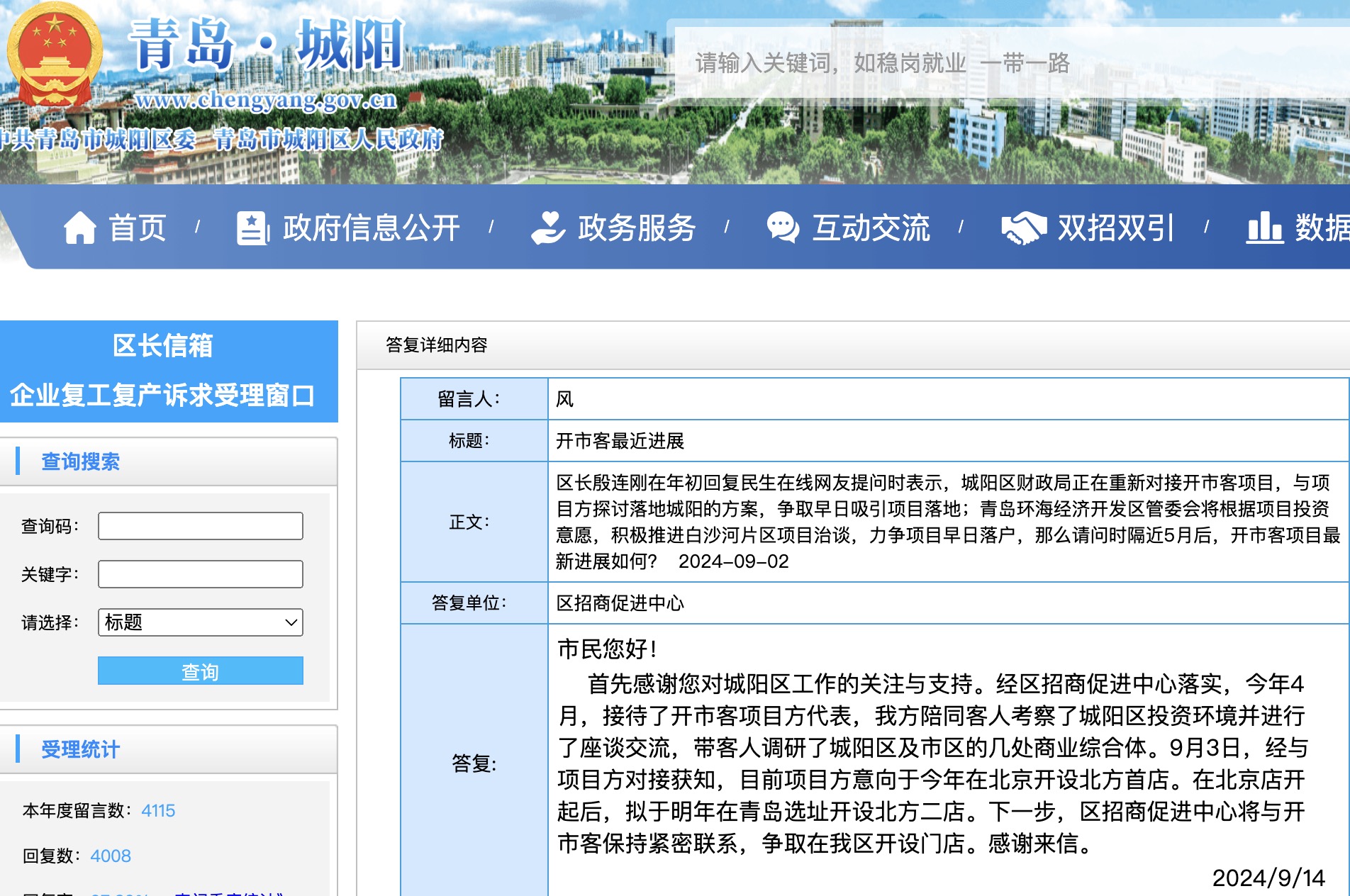 近日有市民在青岛城阳政务网的区长信箱咨询Costco开市客项目的最新进展,城阳区招商促进中心答复称,9月3日,经与项目方对接获知,目前项目方意向于今年在北京开设北方首店,在北京店开起后,拟于2025年在青岛选址开设北方二店。
