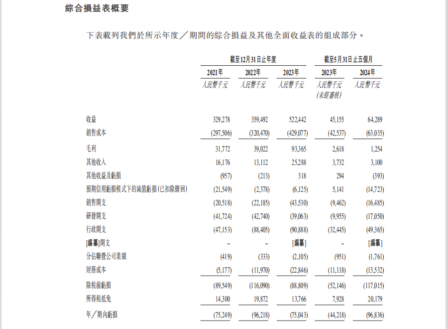 招股书显示,在2021-2023年和2024年前五个月,国富氢能的营业收入分别为3.29亿元、3.59亿元、5.22亿元和0.64亿元。同期,毛利分别约3177.2万元、3902.2万元及9336.5万元和125.4万元。