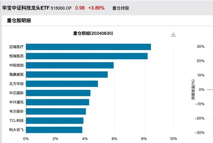 Wind数据显示,华宝中证科技龙头ETF重仓股包括迈瑞医疗(300760.SZ)、恒瑞医药(600276.SH)、中际旭创(300308.SZ)、海康威视(002415.SZ)等。