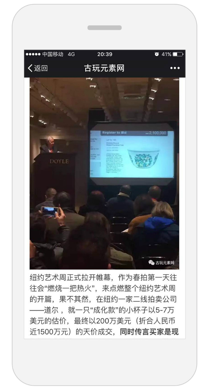 负责本次拍卖的是纽约一家叫“道尔”的二线拍卖公司,随着拍卖师的入场,会场瞬间陷入沉静。大家都屏息凝神,等待着今天的主角——“成化斗彩杯”登场亮相。
