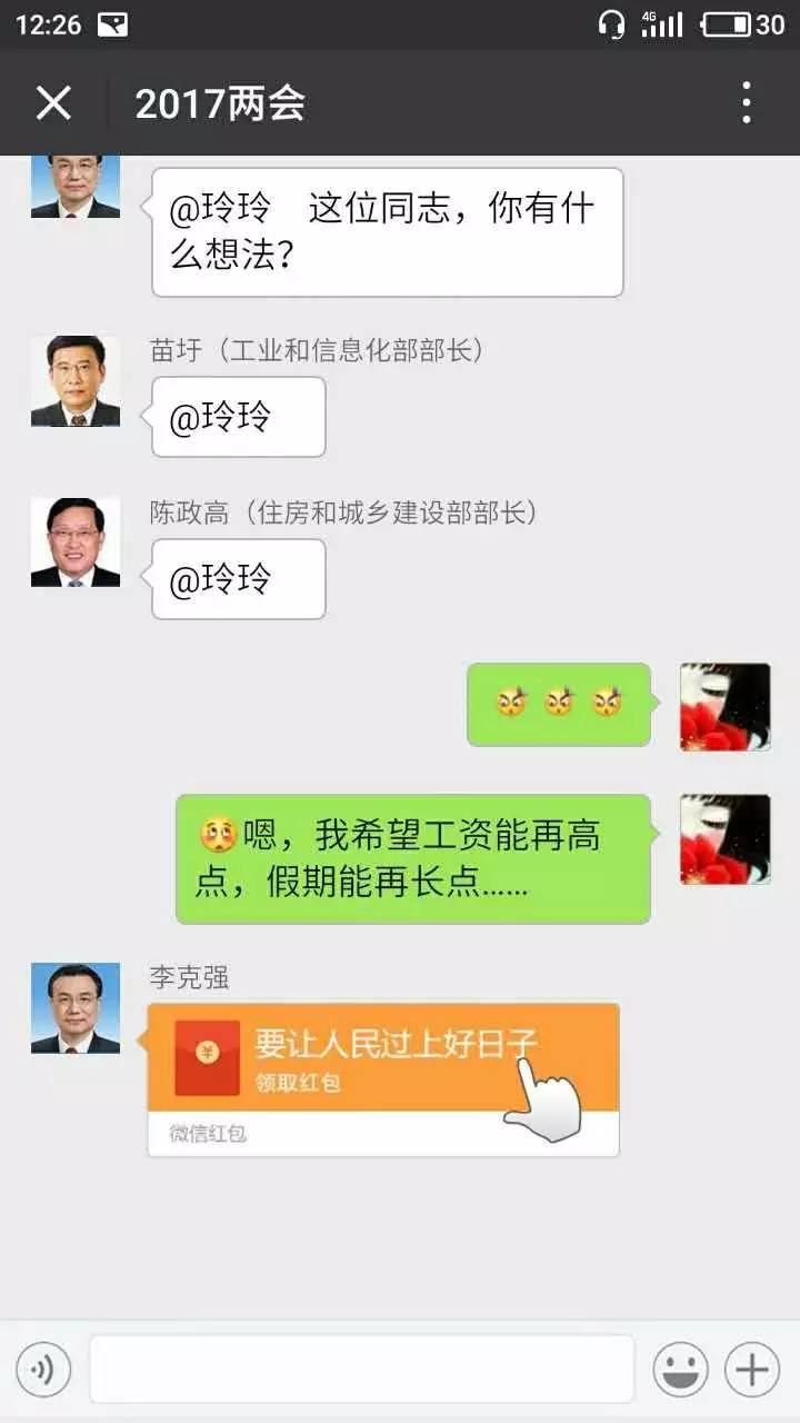 在手机模拟页面输入密码0305后,页面会自动进入微信群聊“两会提案”,李克强总理、苗圩、陈政高分别@人民网客户端用户(也就是操作H5的你啦)并提问:你有什么想法?当然是希望可以工资能再高点,假期能再长点……李克强get了这个想法后,还发了红包给你,点击红包后,进入了朋友圈。