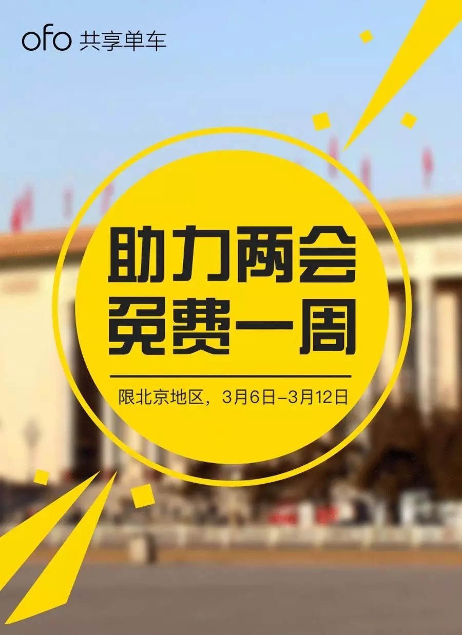 动作1:两会期间的3月6日至3月12日,ofo推出“助力两会,免费一周”活动,北京地区用户全部免费!(补充说一句,其实ofo的对头摩拜单车也推出了免费周活动)