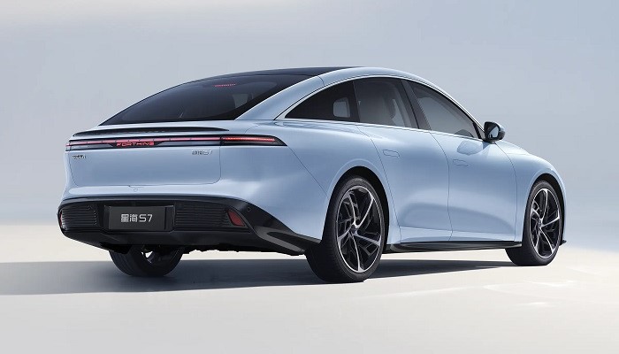 星海S7车身侧面呈溜背式造型,配备了19至20英寸的低风阻轮辋和隐藏式门把手,无框车门设计,风阻系数仅为0.191。车尾部分继续使用线段式贯穿灯组,并配备了具有无级自定义高度调节和记忆功能的掀背式尾门,这一设计对提升行李取存便利度有所帮助,部分车型还增加了黑色“小鸭尾”扰流设计。