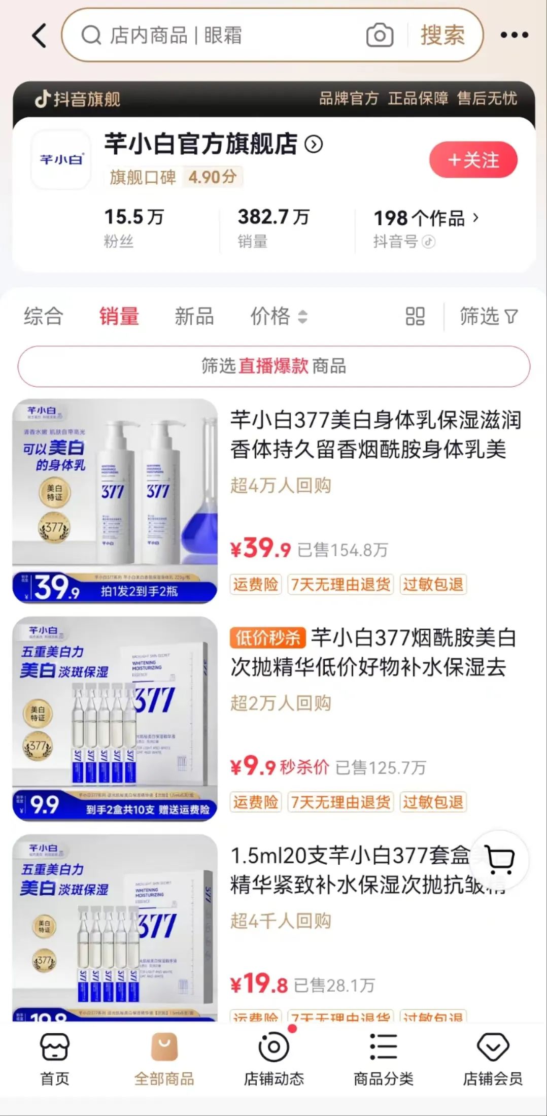 芊小白官方旗舰店数据显示,220g*2瓶装售价39.9元的芊小白377美白身体乳已售154.8万件,超4万人回购。店内销量第2的产品为芊小白377烟酰胺美白次抛精华,价格极低,1.5ml*20支,售价仅19.8元。