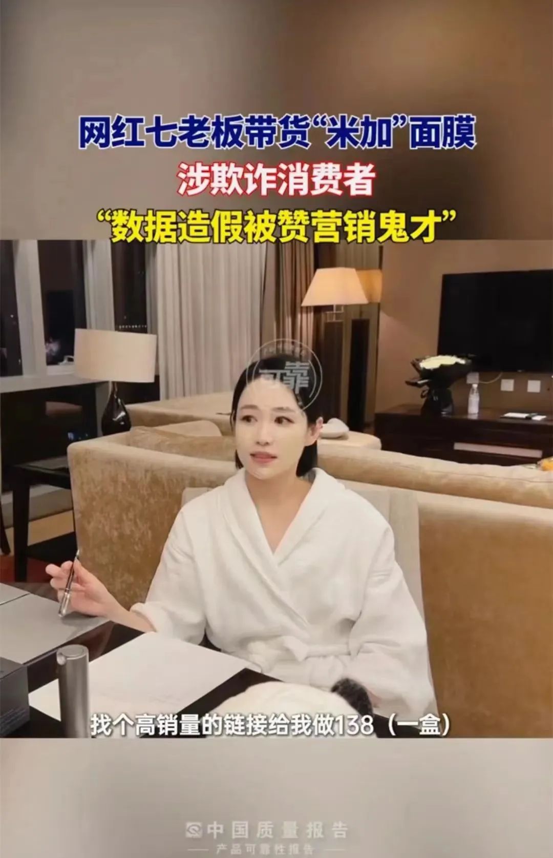 第一段爆料视频中,七老板身着一件白色浴袍,与米加品牌的相关负责人就直播带货合作展开谈判。七老板提出了“价格定高高的,拉个逼格在那,能卖1单是1单,卖1单等于平常卖10单”的策略,并暗示通过虚假数据来营造热销氛围。