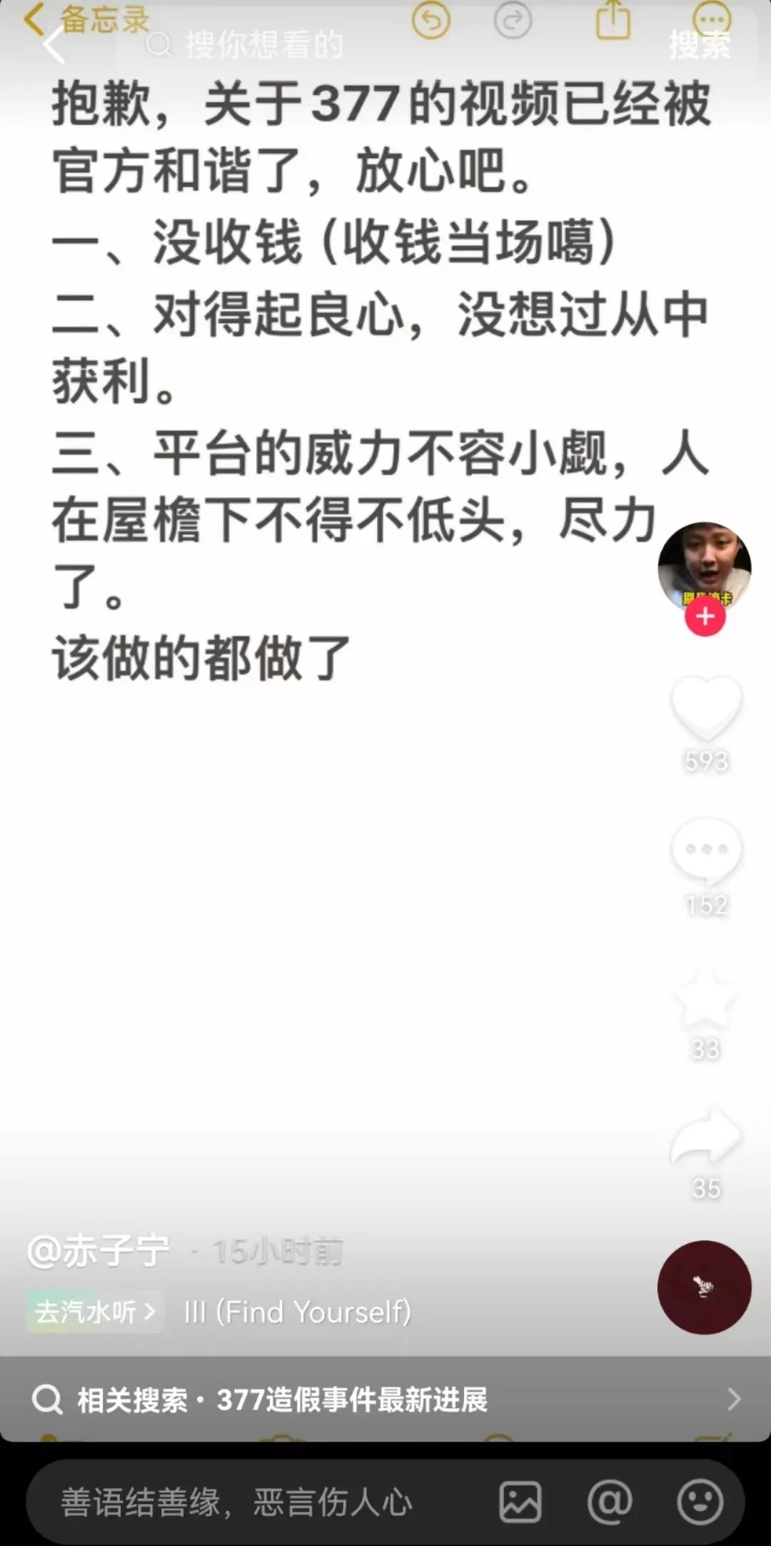 笔者注意到,该博主近日在其账号中发文表示抱歉,关于377的视频已经被官方和谐,并强调自己没有收钱,也从没想过从中获利。同时,他感叹平台的威力不容小觑,人在屋檐下不得不低头,自己已经尽力了。