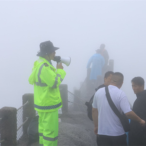 “朋友们小心脚下,注意路滑!”“后面的朋友抓紧栏杆扶手,注意身体平衡,安全第一!”“单向通行,不要拥堵!”……在沉稳且有穿透力的喊声中,一抹荧光绿格外的显眼。这是“天都小二哥”程晴国身穿制服,正在手持喇叭,站立在鲫鱼背一旁的岩石上耐心细致地提醒着过往游客。