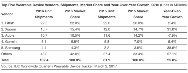 其实从去年诸多统计机构对于Fitbit所处的可穿戴设备市场全年的销量统计看,Fitbit依然处在全球第一的位置,且销量仍呈现同比增长。我们在此以IDC的统计为例,去年按销量计算,Fitbit以22%的市场份额位居第一位,同比增长2.4%,但不比不知道,一比吓一跳。虽然仍是第一,但Fitbit的市场份额与2015年的26.8%相比,下滑了4.8个百分点,同比增长率仅是整个市场年均增长率25%的1/10。