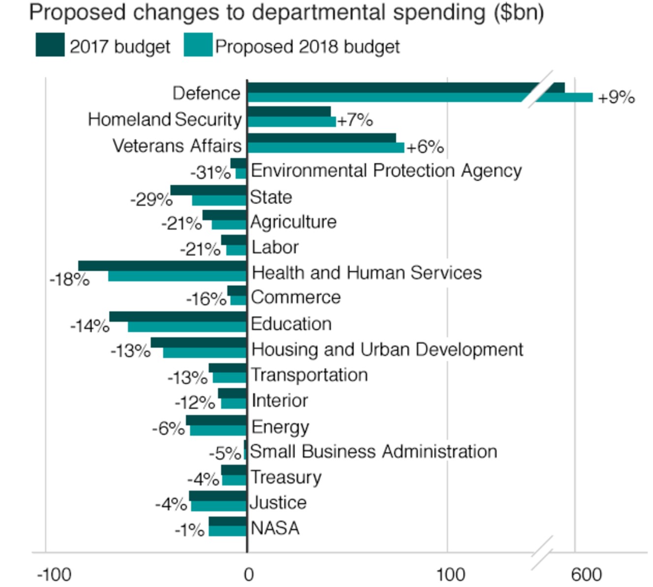 在这次预算提案中,美国政府的15个内阁机构中只有国防部、国土安全部及退伍军人事务部3个涉及国防国安部门的预算经费得以增加,增加总额达590亿美元,其余12个部门都将被削减预算,削减总额为573亿美元。此外,内阁级别的环境保护部的经费也被大幅削减,比例高达31%的。一些人文艺术研究机构的经费则被完全砍掉。不过,该预算提案还需经过国会批准才能最终付诸实施。