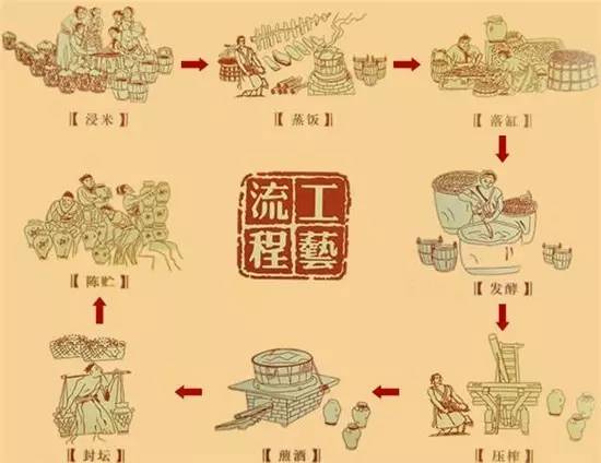 浸米——蒸饭——落缸——发酵——压榨——煎酒——封坛——陈贮