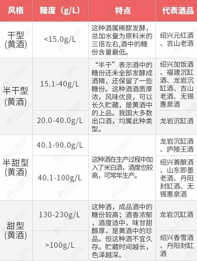 黄酒从甜度来区分可分为干型、半干型、半甜型、甜型四种,在绍兴黄酒中,这四种类型又被称为:元红、加饭 、善酿、香雪。除了绍兴,四种风格都产的地方很少,各地各有所长,比如绍兴的经典是加饭酒、 福建擅长酿造沉缸甜酒 。
