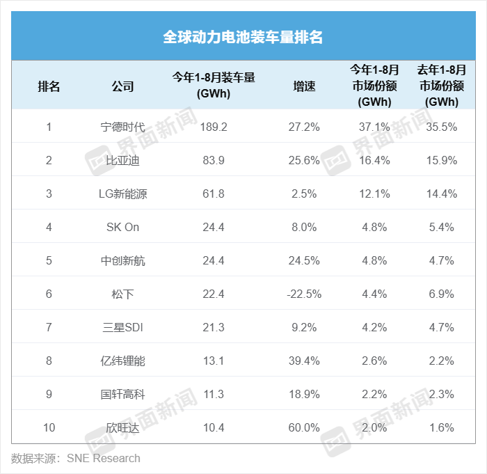1-8月全球动力电池装机排名出炉,中国企业的市场份额又提高了。