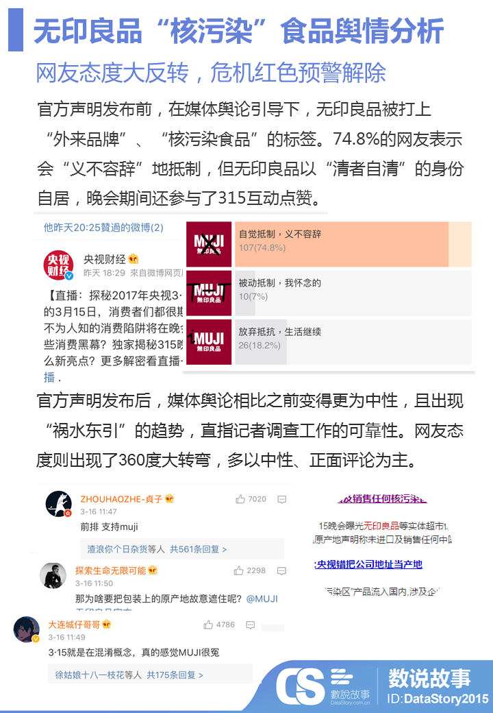 我们将危机公关级别分为谣言诽谤、剧情反转、真是事实等不同级别。相比百度百科事件的板上钉钉的事实,凭借着多方“证据”,无印良品已暂时性的实现“剧情反转”,网友、媒体态度均出现一定程度转变,事件继续发酵的可能性减弱。
