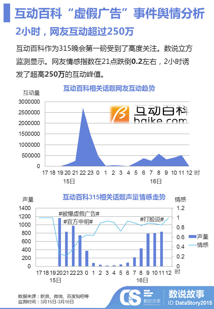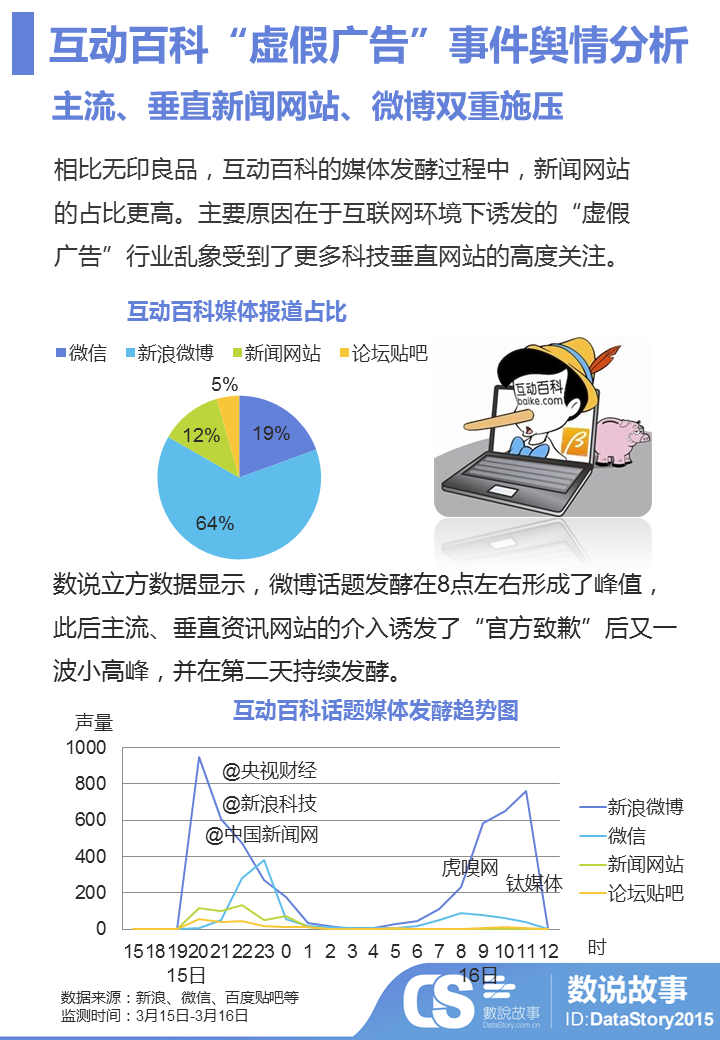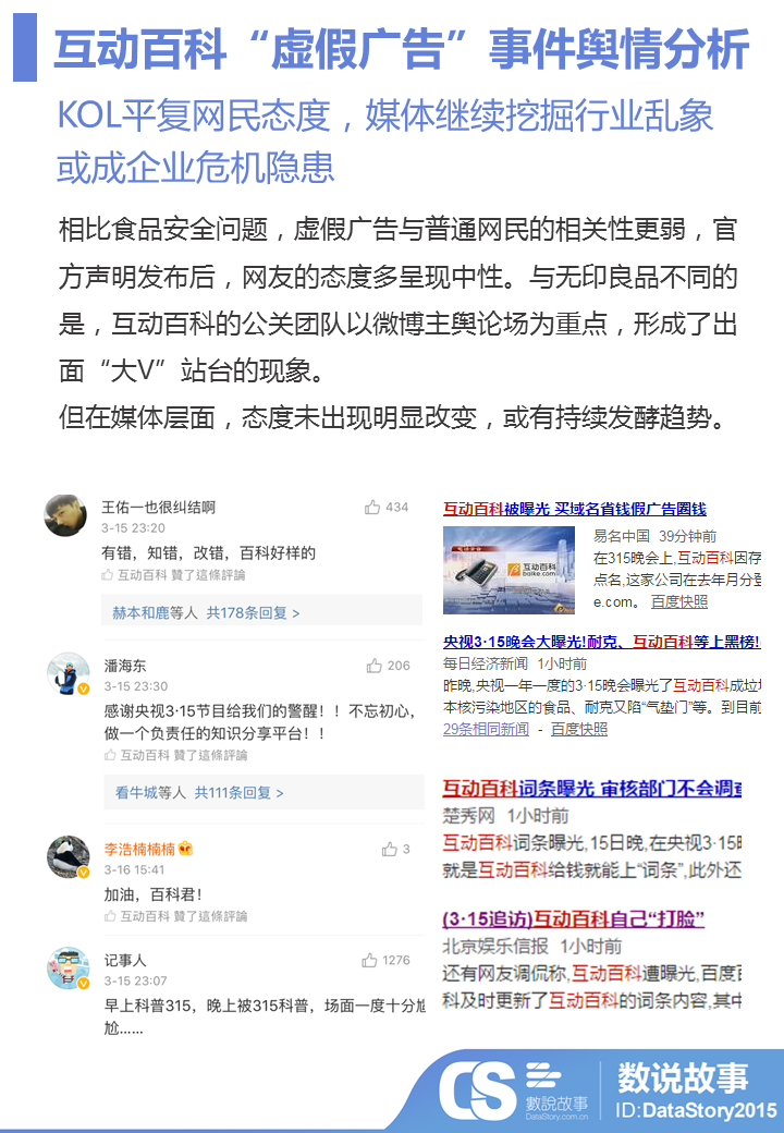 在百度百科的应对中,其快速做出反应并发声明,一定程度上减弱了负面评论发酵,但对于声明本省而言,不少网友还是认为其套用公关“模板”,真诚度不够;其次,互动百科官方也缺少了媒体层面跟的打通,所以,目前网友态度逐渐中性化基础上,媒体对于行业乱象的发掘或会带来危机隐患。
