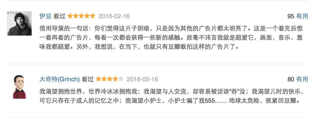豆瓣的用户收割的是中国的文青人群,这些人的思维方式、阅读方式、生活方式,甚至梦想,都有什么样的属性和调性,豆瓣的这支定位视频给出了一个范例,我们可以通过豆瓣粉丝的留言看出这一点。