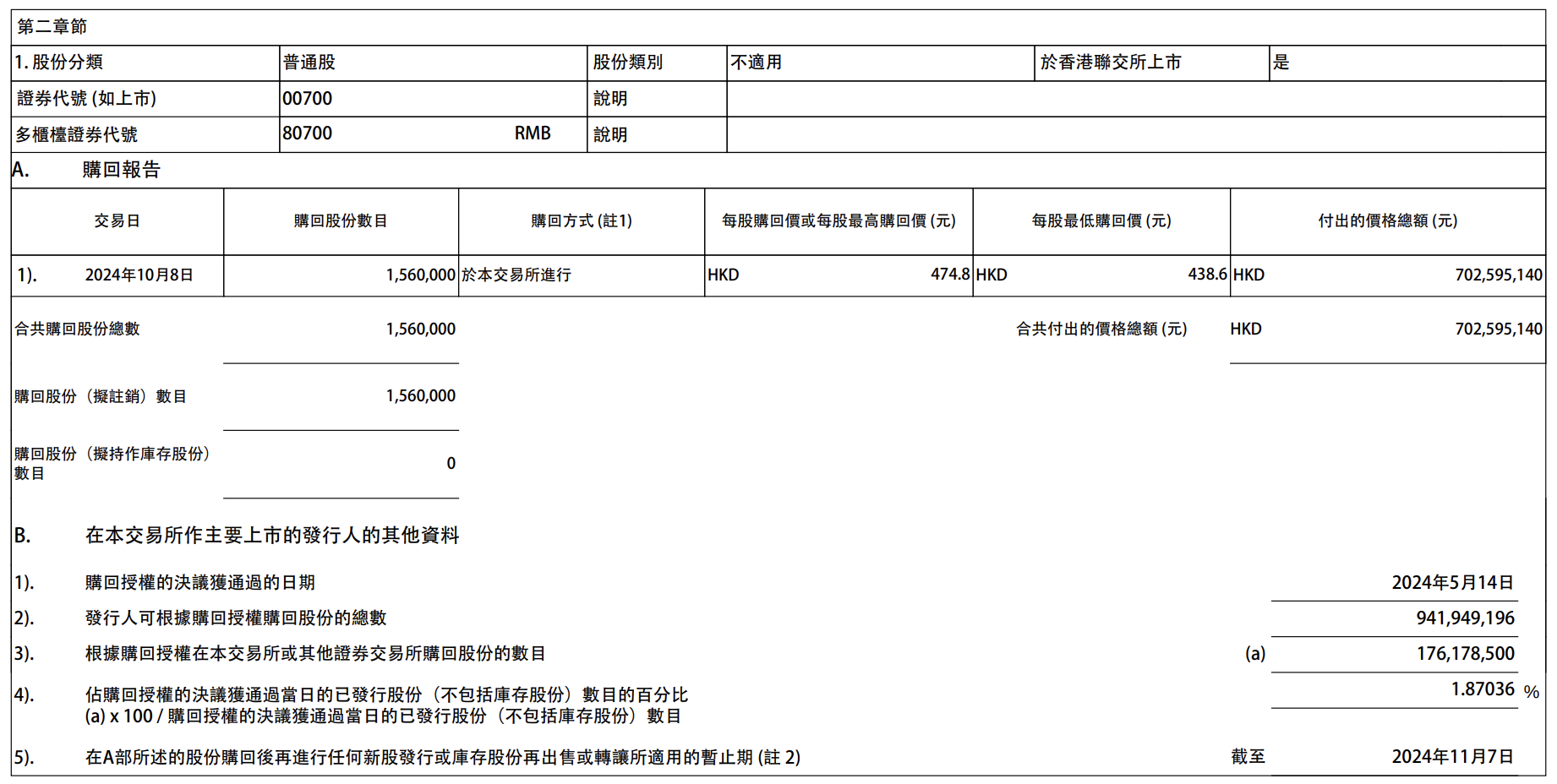 腾讯控股10月8日在港交所公告,10月8日耗资约7.03亿港元回购156万股公司股份,每股回购价格438.6港元-474.8港元。