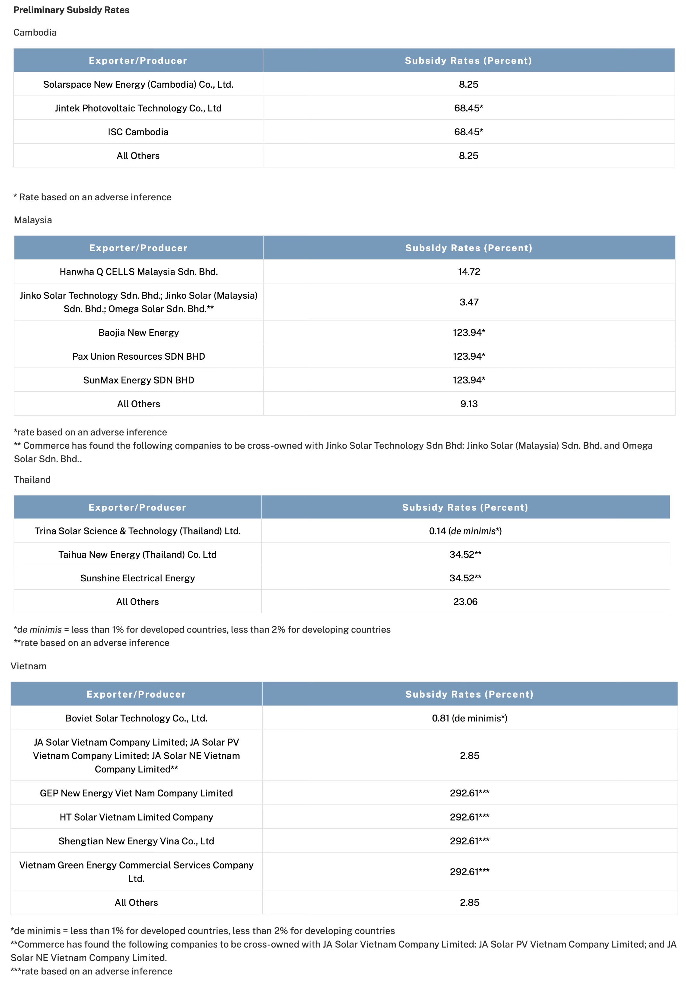 美国国际贸易管理局官网公布的表格数据显示,有四家在越南建厂的企业初裁反补贴税率最高,达292.61%,包括Shengtian New Energy Vina Co.,Ltd等;三家在马来西亚建厂的税率达123.94%,包括Baojia New Energy等。