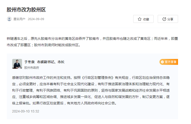 到了2020年5月,时任胶州市政府主要领导公开表示,胶州确有撤市设区的计划,但具体流程还需等待各级批复,尚无确切时间。