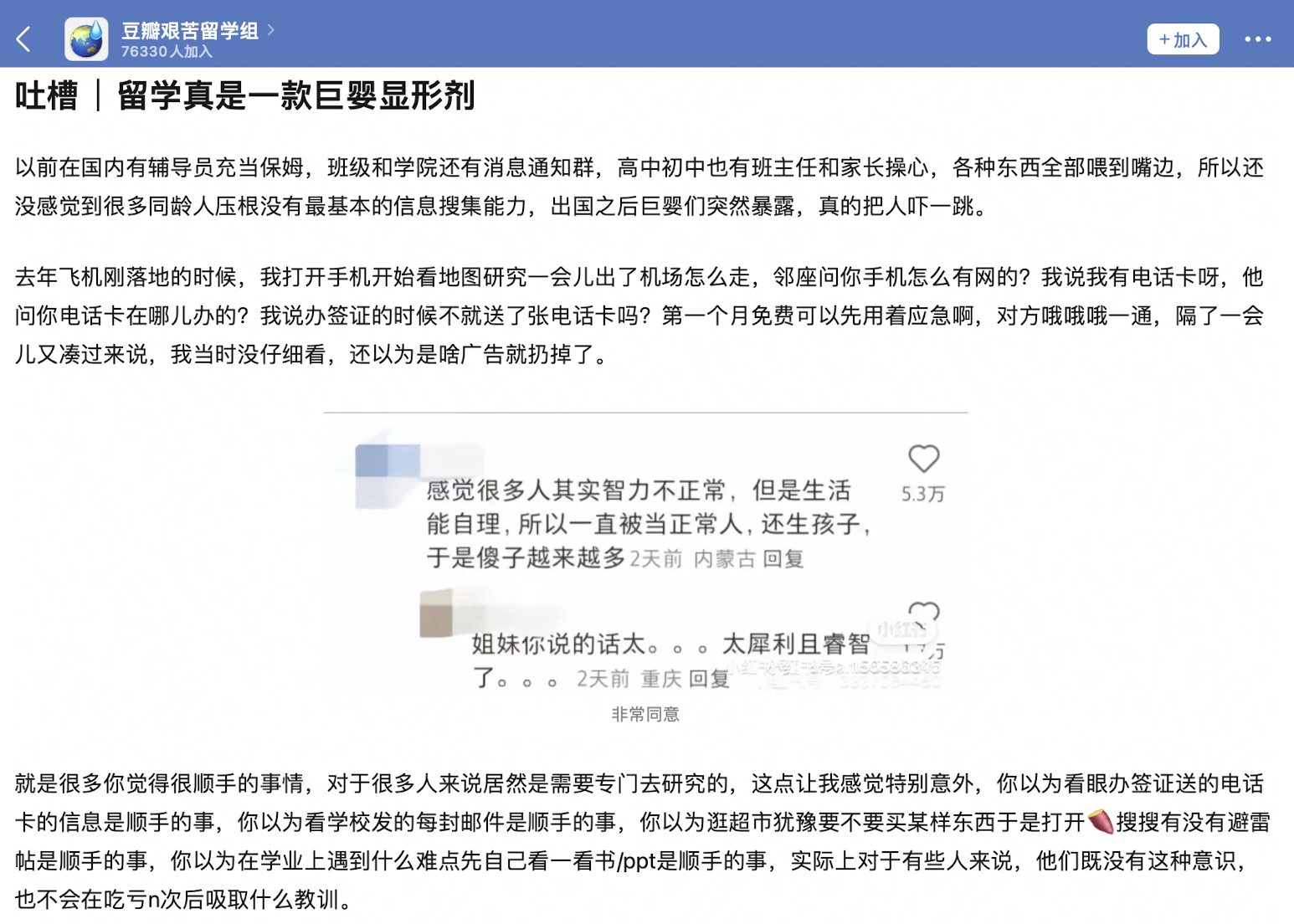 界面文化:豆瓣的艰苦留学小组里有一则阅读量很高的帖子说,留学是一款巨婴显形剂。你如何看待这样的吐槽?