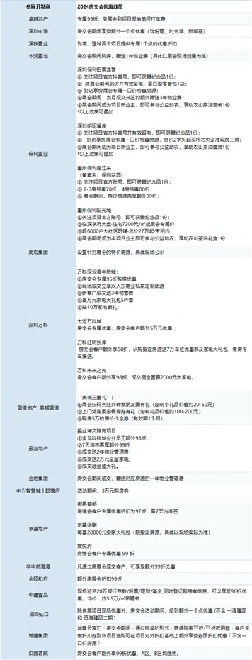 此外,各大开发商在此次盛会中也展现出了极大的诚意。例如,卓越地产推出了专属99折优惠,并在房展会期间为购房者报销单程打车费;深圳中海的中海珑悦理、中海时光境、中海新都荟则提供了享受额外一个点优惠;保利置业则推出了特惠房源、赠送物业费、折扣等超值优惠。这些优惠措施不仅彰显了开发商的诚意,更为购房者提供了难得的置业良机。
