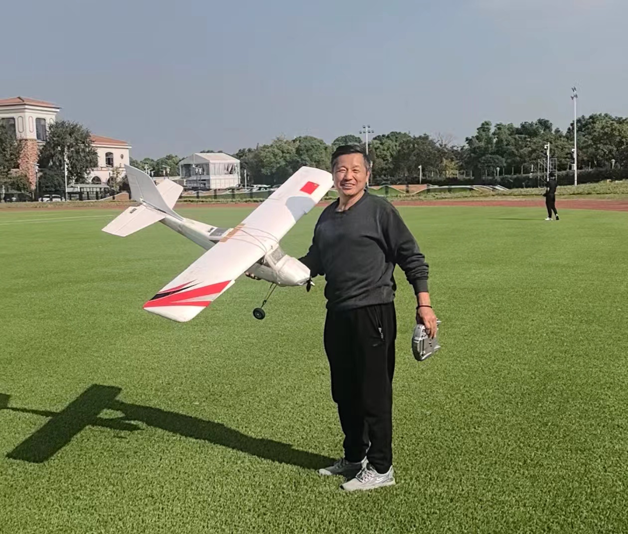 2024年10月9日下午,十几位上海爷叔在宝山区青少年活动中心的操场上,进行了航空模型表演。他们操控的航模飞机在天上上下翻飞,引来观众阵阵欢呼。