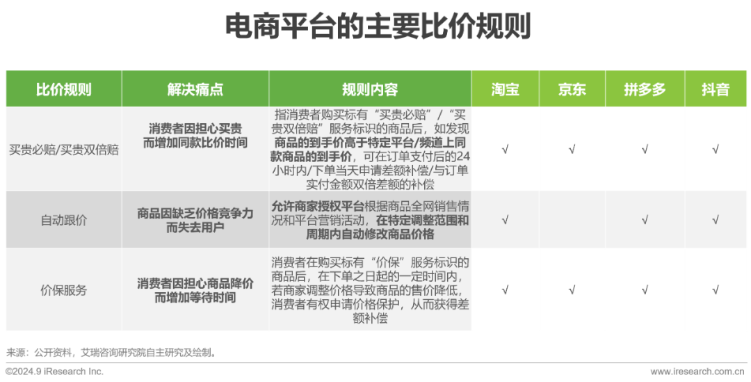 比价优势的争夺是各家平台低价竞争的重要着力点。买贵必赔、自动跟价与价保服务等比价规则是建立比价优势的重要抓手。其中,买贵必赔与价保服务有助于减少购物的比价时间与担心降价的犹豫时间,自动跟价有助于动态调整平台商品价格,保障平台商品价格竞争力的领先性。因此,这三个重要抓手有利于提高消费者购买决策效率,增加平台的下单率。可见,随着电商平台竞争的升级,比价优势争夺也必将愈加激烈。